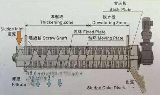 設備運行時,污泥從進料口進入濾筒后受到螺旋軸旋片的推送而向卸料口移動,由于螺旋軸旋片之間的螺距逐漸縮小,因此污泥所受的壓力也隨之不斷增大,并在壓差作用下開始脫水,水份從固定板與活動板的過濾間隙流出,同時設備依靠固定板和活動板之間的自清洗功能,清掃過濾間隙防止堵塞,泥餅經過充分的脫水后在螺旋軸的推進作用下從卸料口排出。