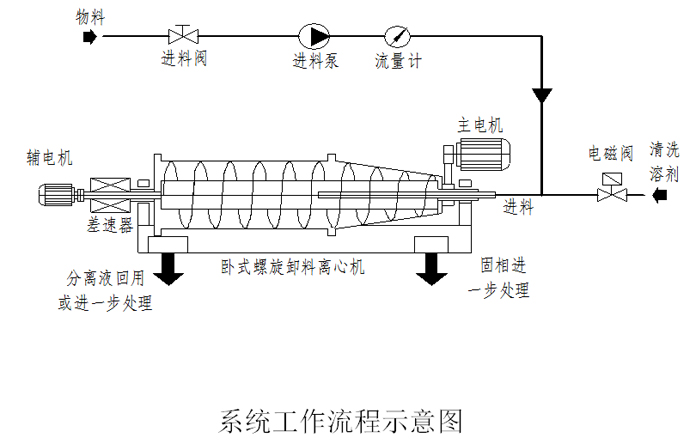 下圖描述了離心機(jī)的主要設(shè)備和系統(tǒng)進(jìn)行工作時的工藝流程,該系統(tǒng)主要包括臥式螺旋卸料沉降離心機(jī)(主機(jī))、電器控制系統(tǒng)、無軸輸送機(jī)、自動控制加藥系統(tǒng)。